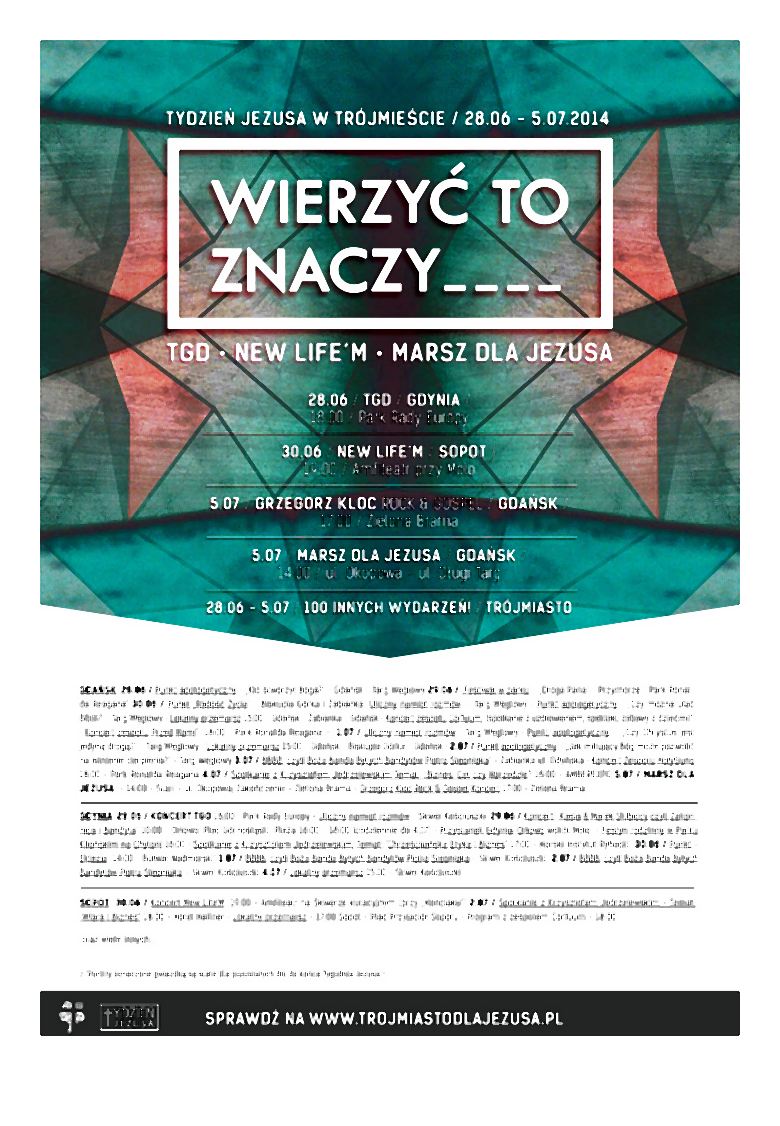 W sobotę, koncertem TGD rozpoczął się trójmiejski Tydzień Jezusa – jedna z największych chrześcijańskich imprez tego lata. Do 5 lipca na terenie Trójmiasta będzie można wziąć udział m.in. w spotkaniach z ciekawymi gośćmi, warsztatach oraz koncertach gwiazd muzyki chrześcijańskiej takich jak np. New Life’M, czy Grzegorz Kloc. W ostatni dzień festiwalu ulicami Gdańska przejdzie radosny Marsz dla Jezusa.